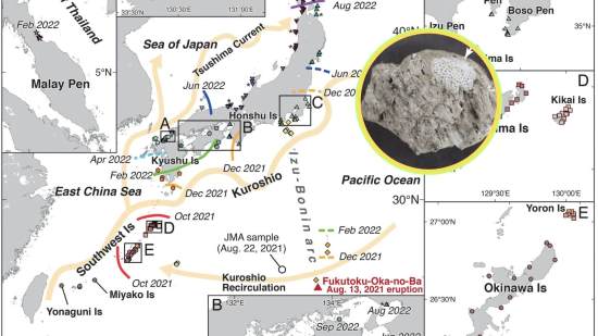 La piedra pómez flotante no solo cruza océanos, sino que también transporta vida marina. Un estudio analiza su evolución tras la erupción del Fukutoku-Oka-no-Ba en 2021.